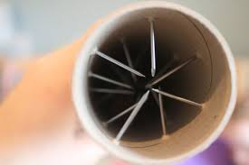 2- Introducir los palillos por el tubo a más o menos unos 20 centímetros de distancia, formando en el interior un cruce entre ellos, y pegarlos con fuerza con cinta para que no se salgan. Posteriormente, hay que cortar en la cartulina las tapas para los extremos del tubo.